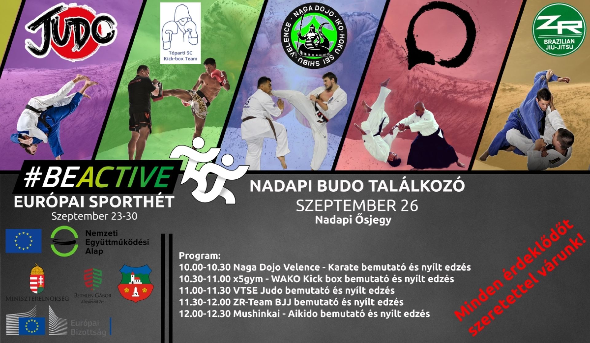 Az elmúlt két évben az Európai Sporthéten Budo-találkozót rendeztünk Nadapon, melyen a karate, a kick-box, a dzsúdó, a brazil jiu-jitsu és aikidó bemutatók és közös edzések kedélyes légkörben váltották egymást a tatamin.